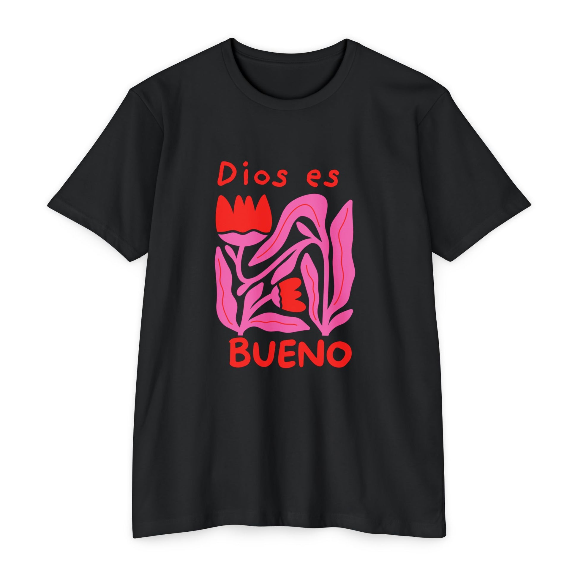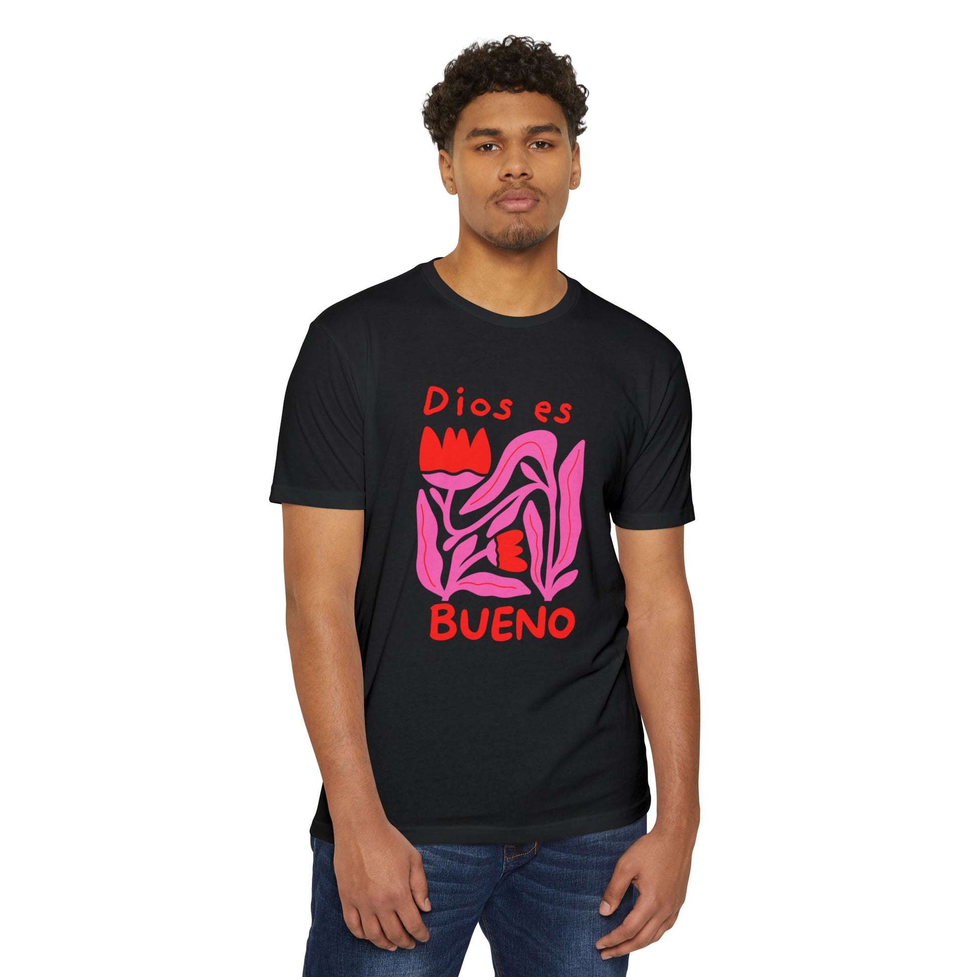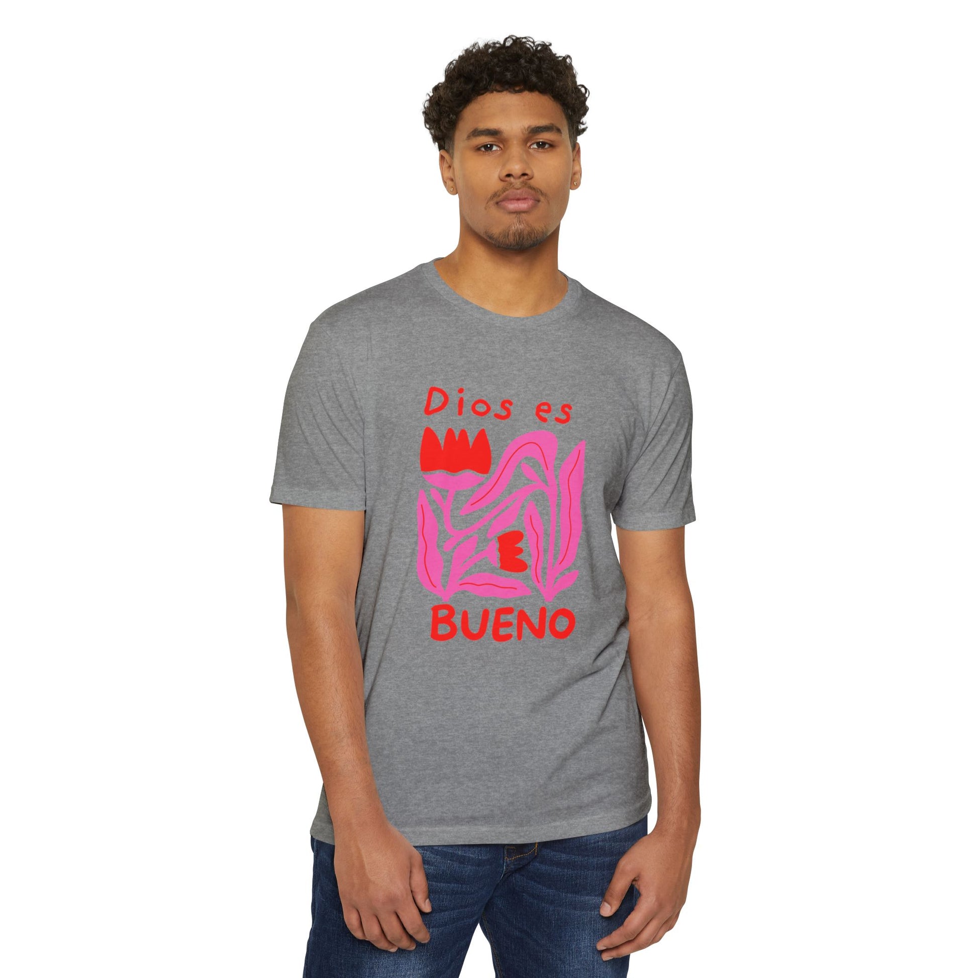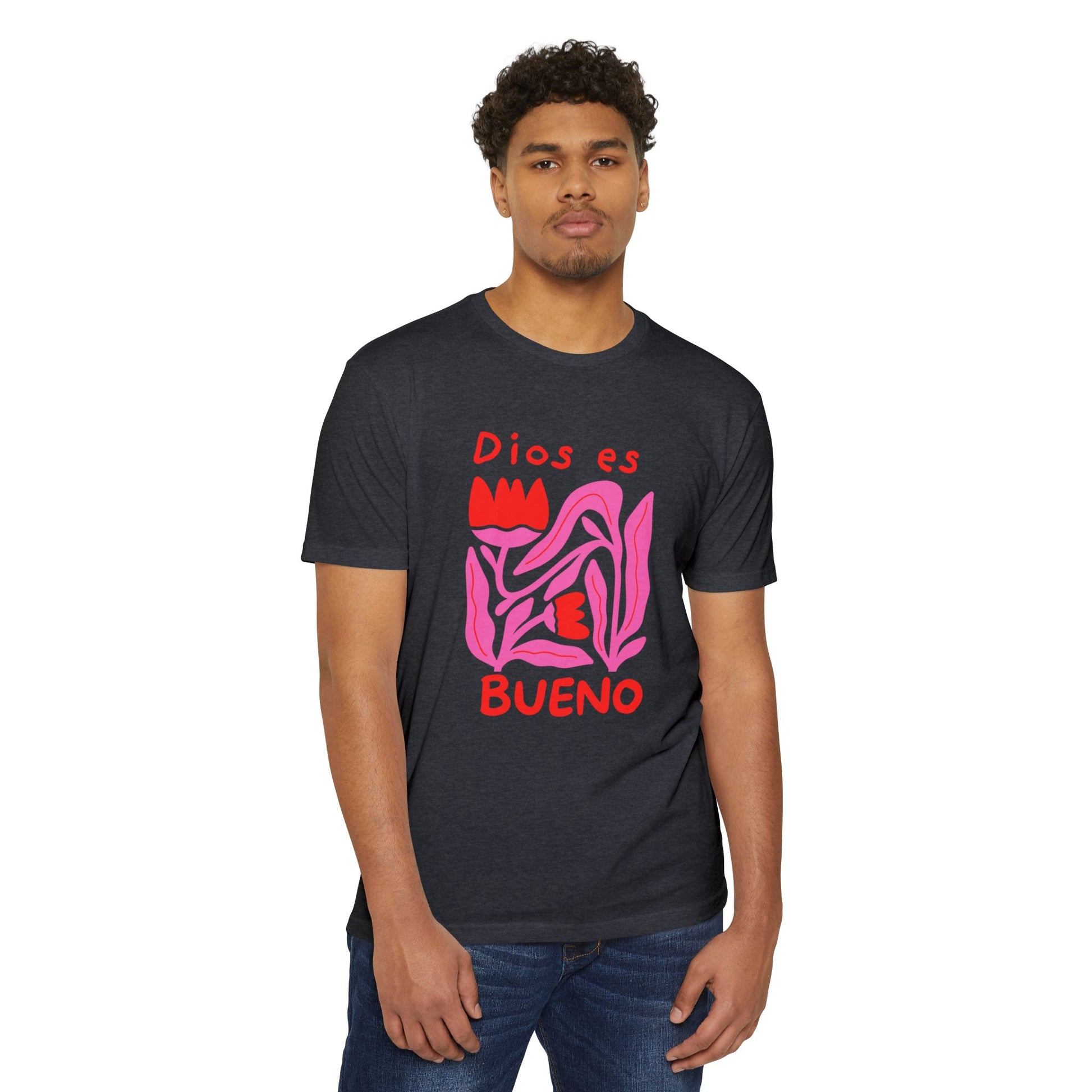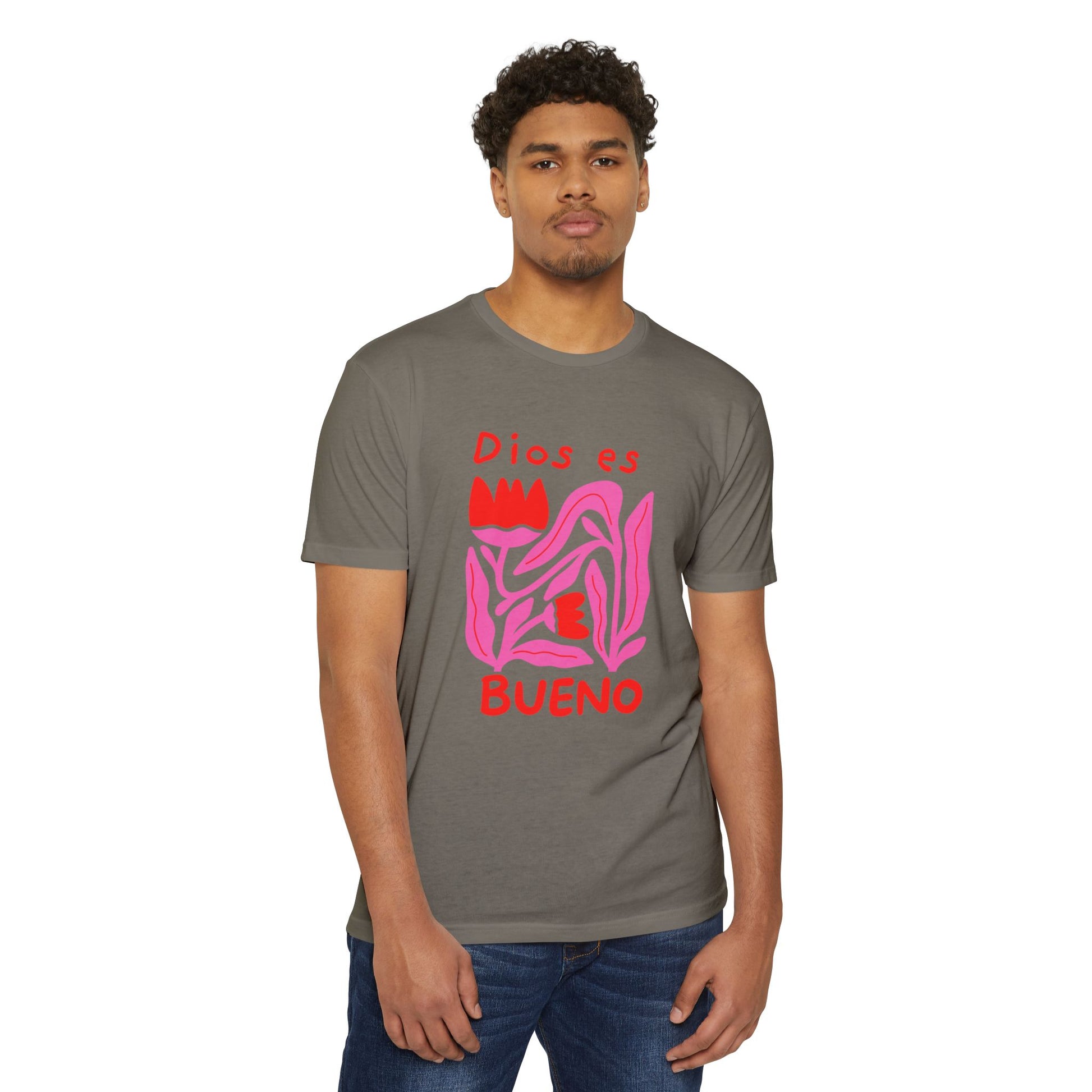 This soft, lightweight tee brings a gentle, heartfelt message to everyday wear. The graphic—a hand-drawn, abstract floral shape in vibrant pinks and reds with the words “Dios es bueno”—feels like a quiet, joyful proclamation you can wear to church gatherings, neighborhood strolls, or laid-back meetups. The fabric drapes easily and the classic fit keeps the silhouette familiar and comfortable. It’s for people who want clothing that speaks to faith and warmth without shouting—an approachable piece that layers under a cardigan or stands alone on warm afternoons. The muted olive background lets the artwork pop while keeping the overall look grounded and wearable.